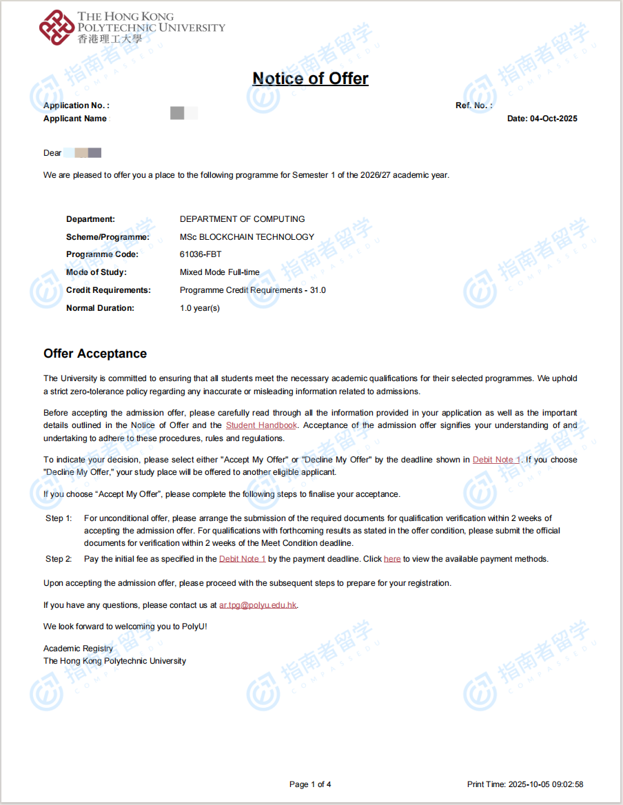 香港理工大學(xué)區(qū)塊鏈科技理學(xué)碩士研究生offer一枚