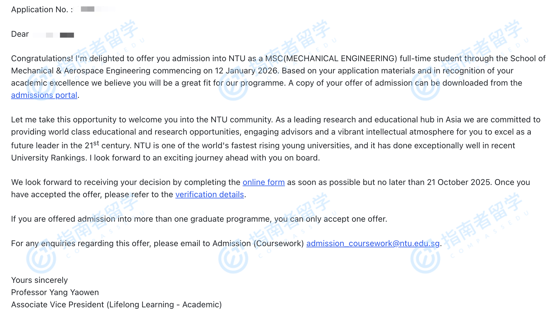 南洋理工大學(xué)機械工程理學(xué)碩士研究生offer一枚
