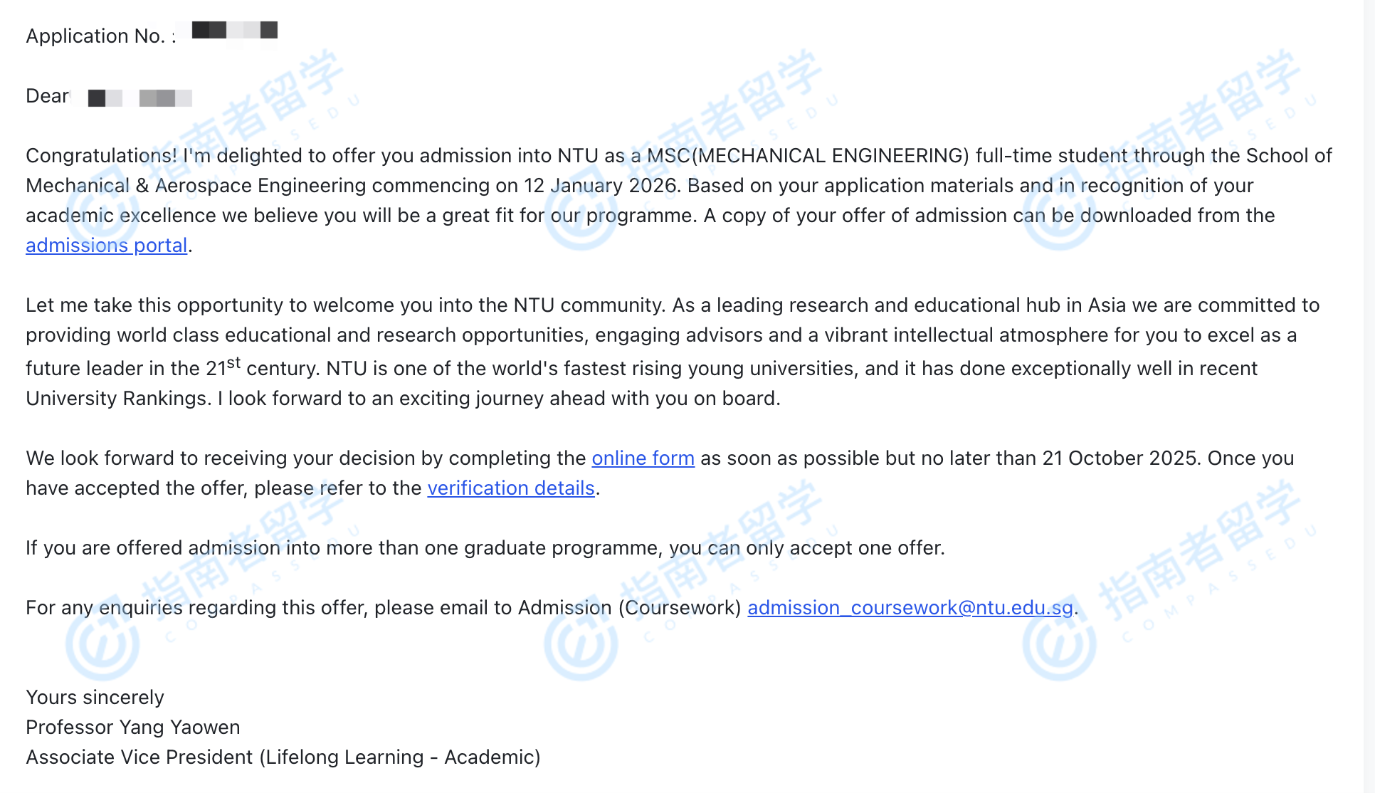 南洋理工大學(xué)機(jī)械工程理學(xué)碩士研究生offer一枚