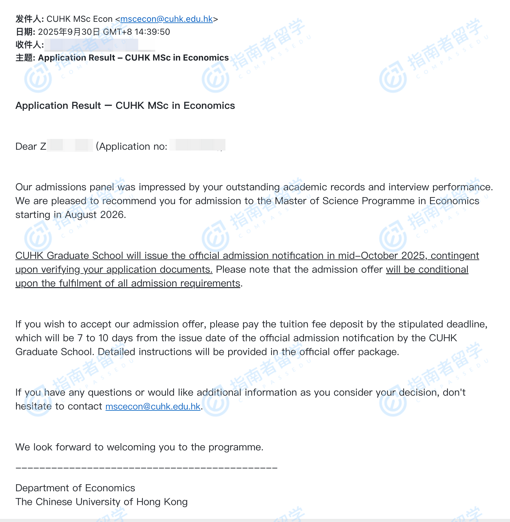 香港中文大學經(jīng)濟學理學碩士研究生offer一枚
