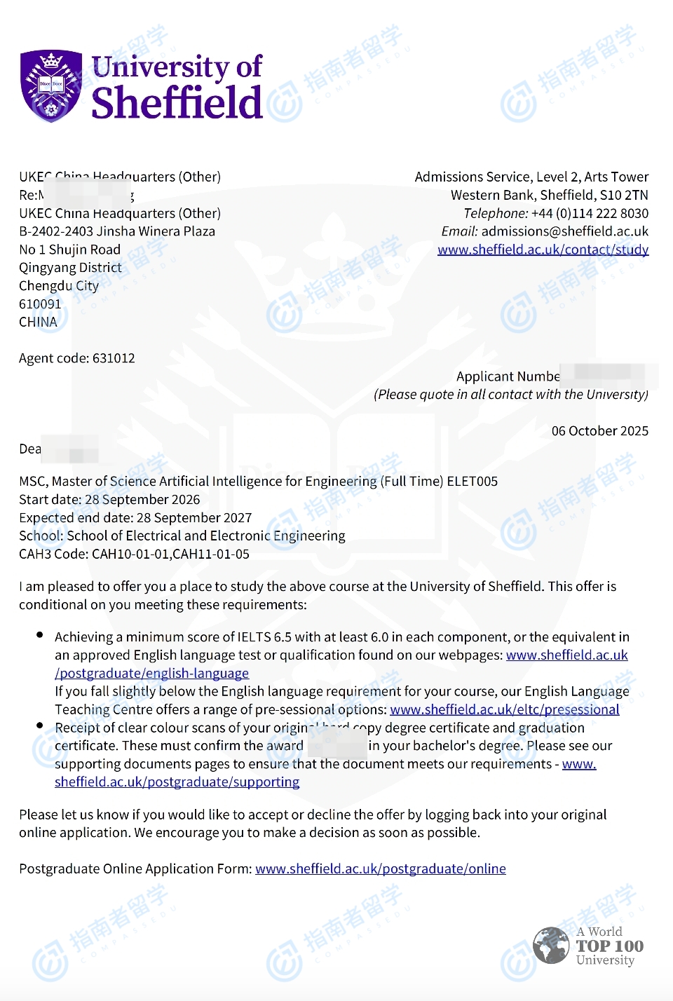 謝菲爾德大學自動化與智能系統(tǒng)理學碩士研究生offer一枚