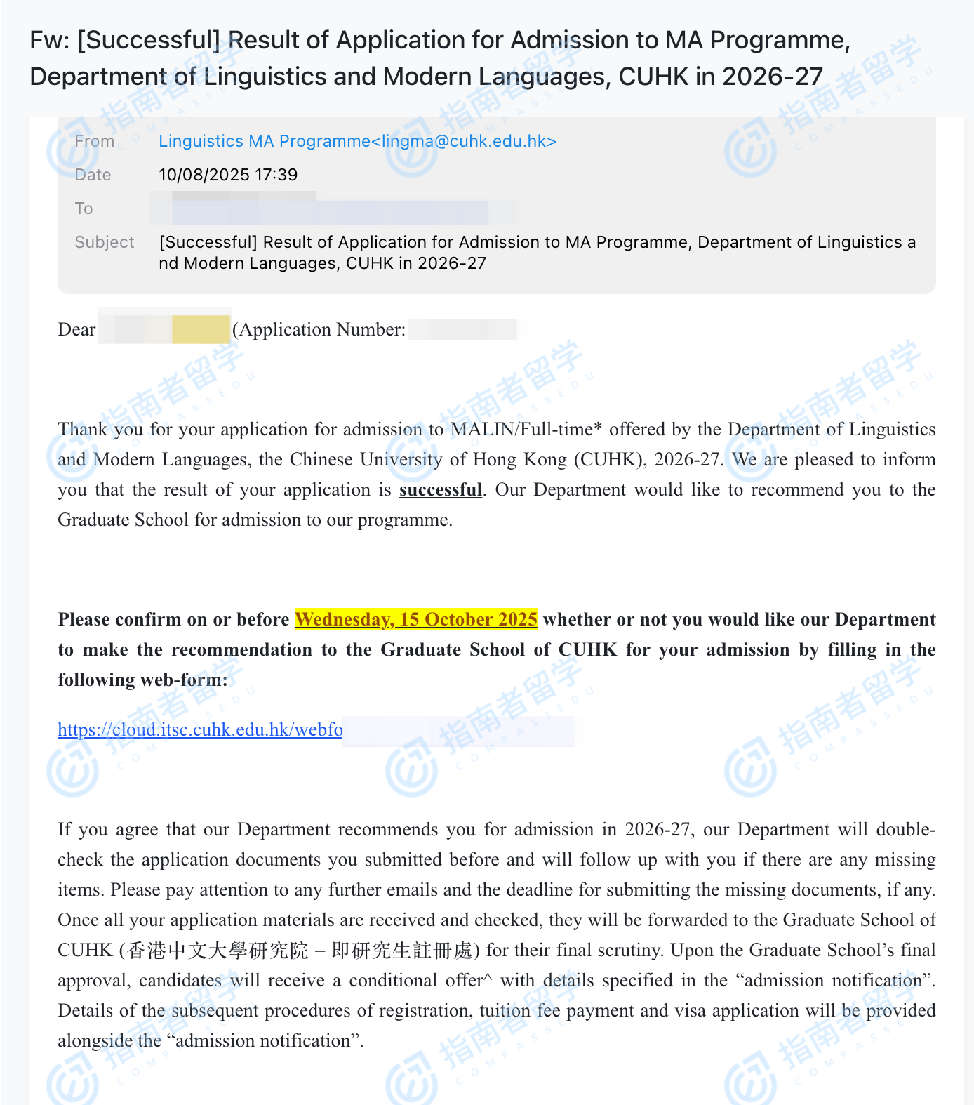 香港中文大學(xué)語言學(xué)文學(xué)碩士研究生offer一枚