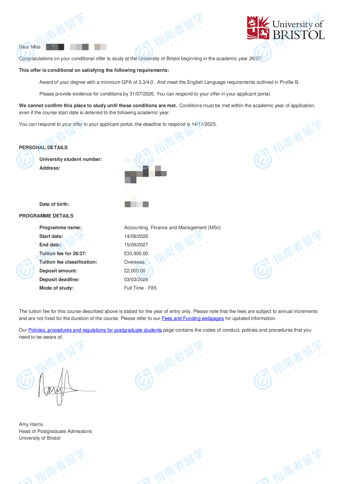 布里斯托大學(xué)會計、金融與管理理學(xué)碩士研究生offer一枚
