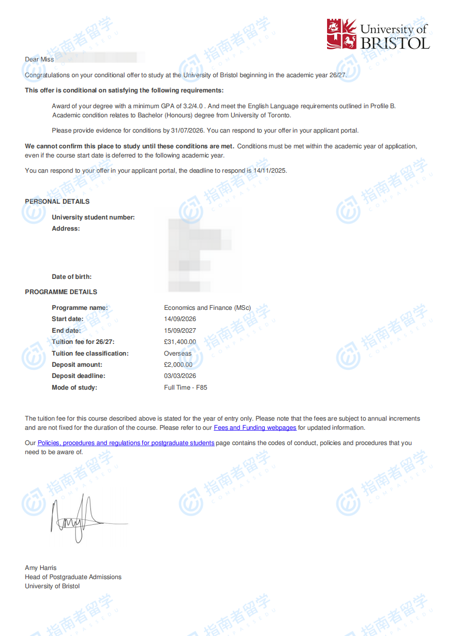 布里斯托大學經(jīng)濟與金融理學碩士研究生offer一枚
