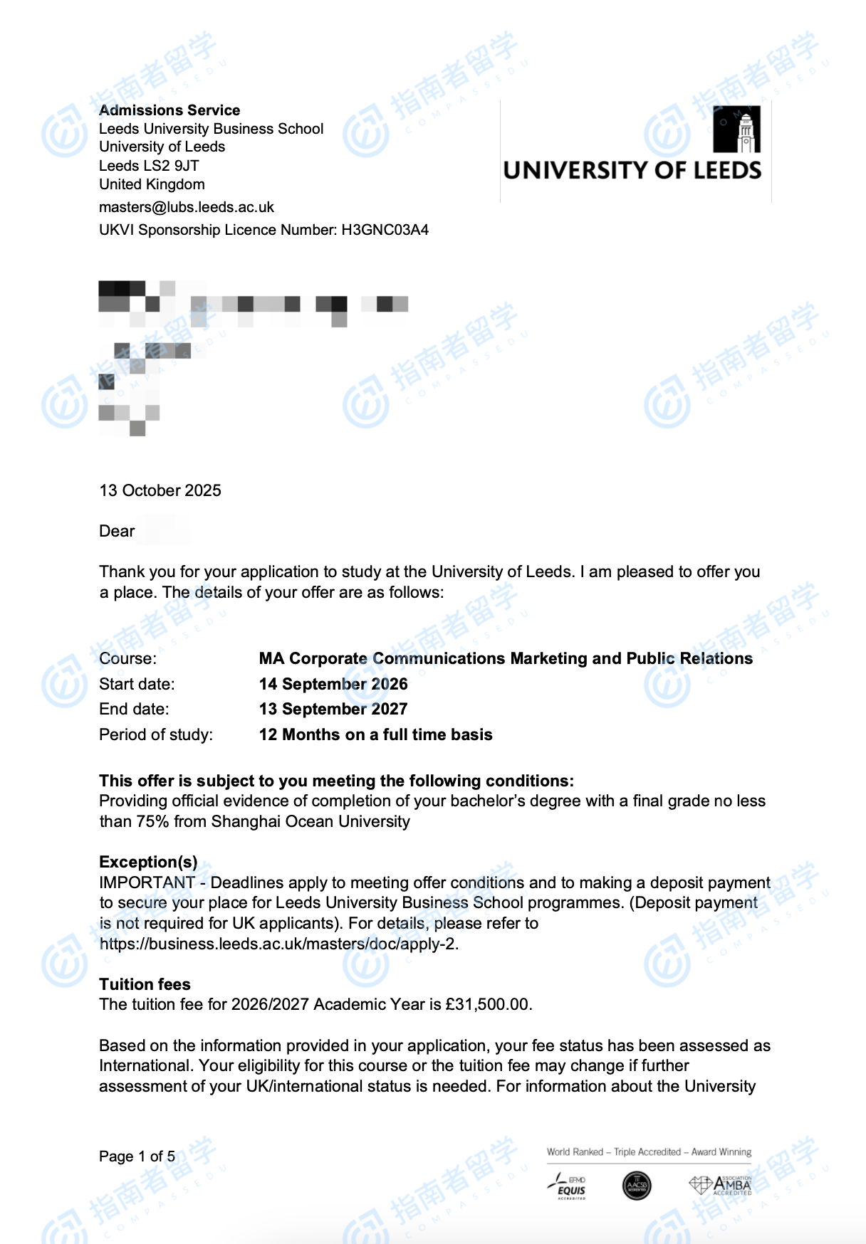 利茲大學(xué)企業(yè)傳播、市場營銷與公共關(guān)系文學(xué)碩士研究生offer一枚