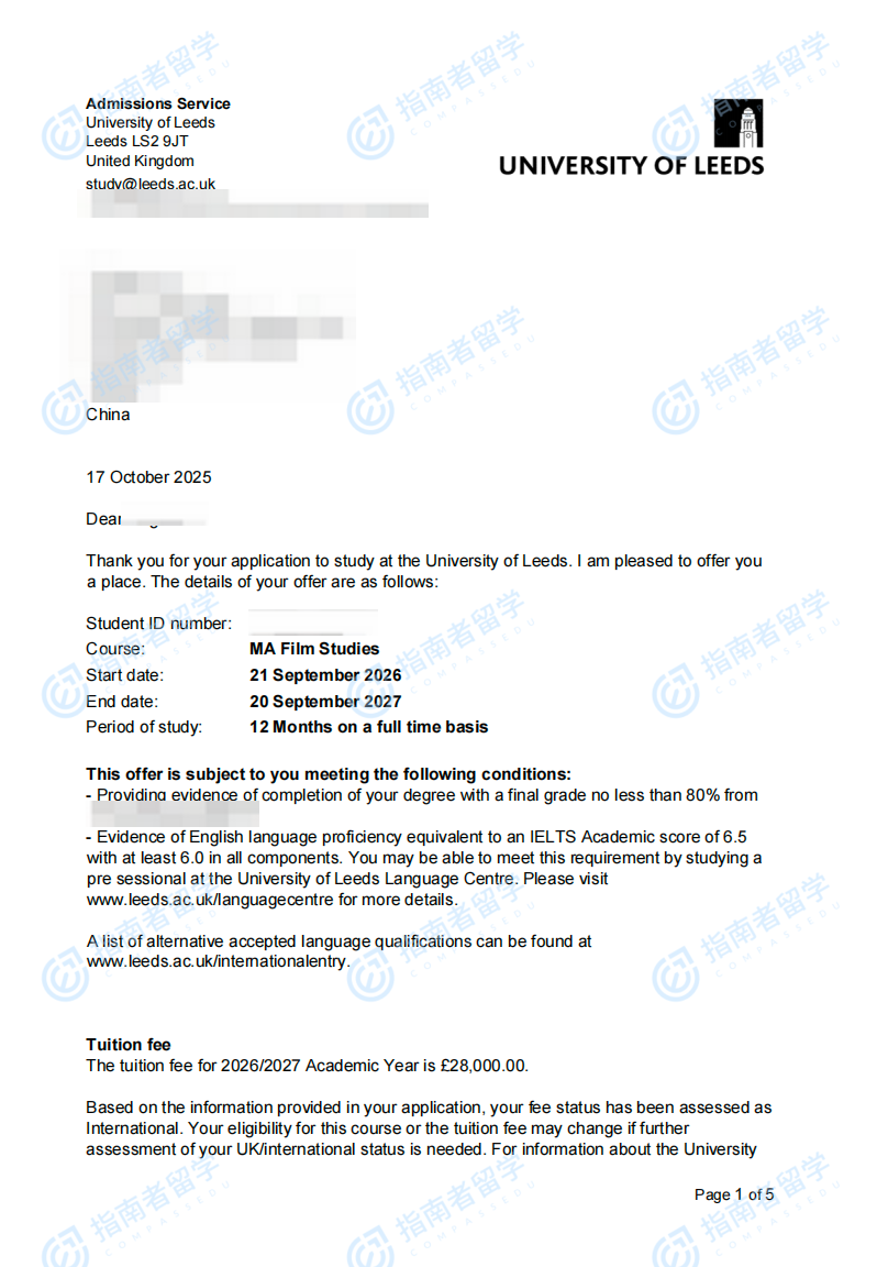利茲大學(xué)電影研究文學(xué)碩士研究生offer一枚