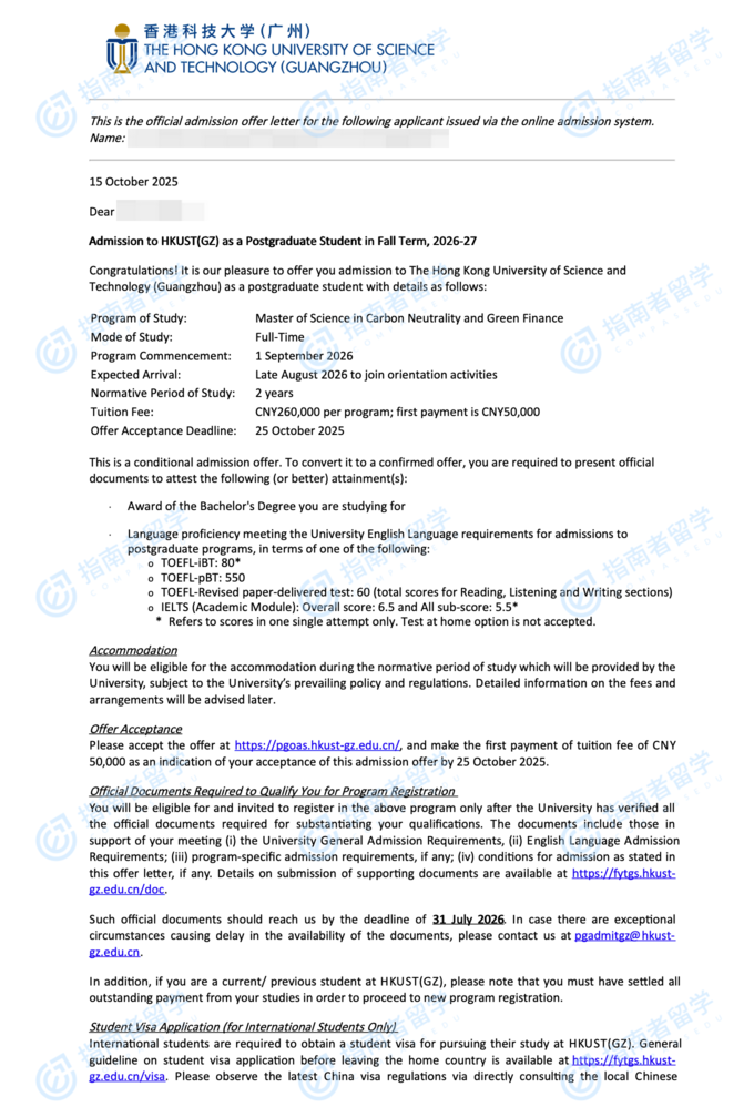 香港科技大學(xué)碳中和與綠色金融理學(xué)碩士(HKUST(GZ))研究生offer一枚