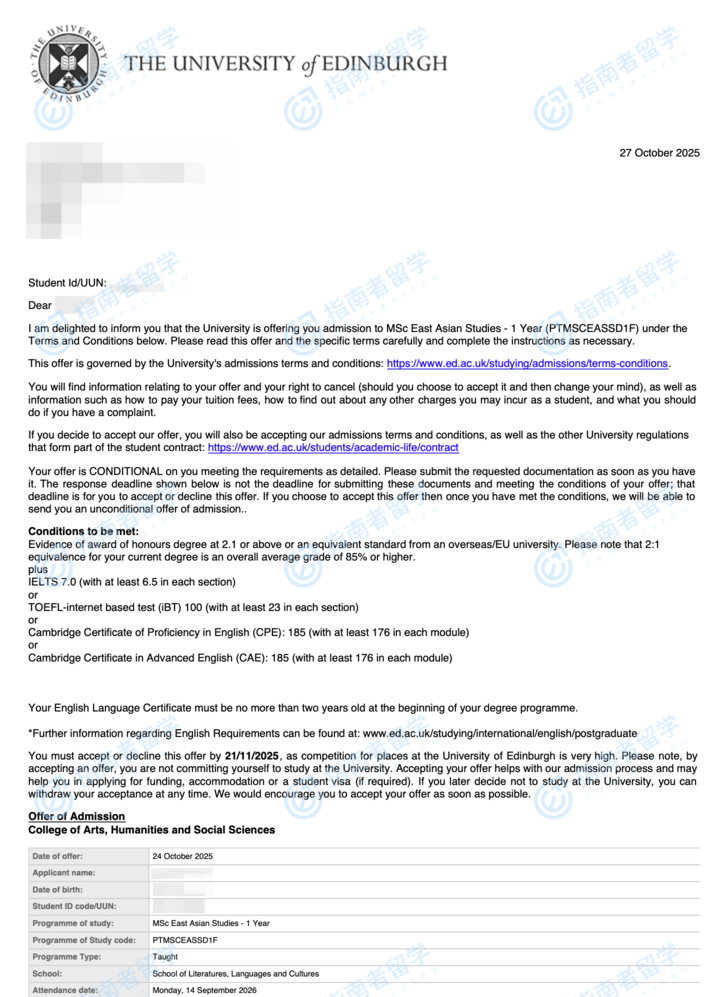 愛丁堡大學(xué)東亞研究理學(xué)碩士研究生offer一枚