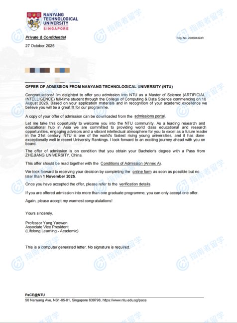南洋理工大學(xué)人工智能理學(xué)碩士研究生offer一枚