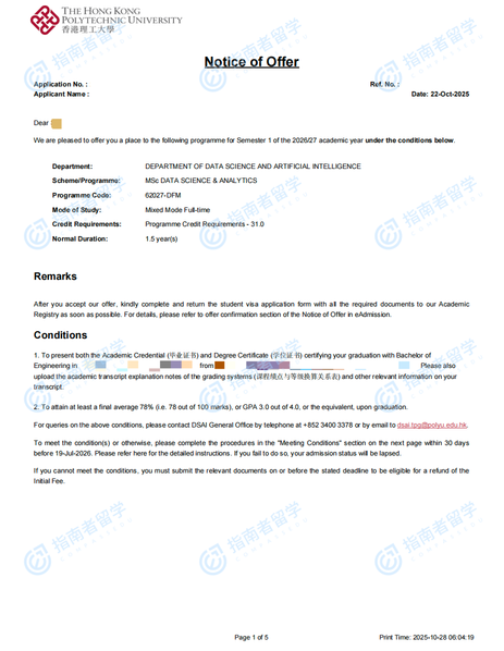 香港理工大學(xué)資訊科技理學(xué)碩士研究生offer一枚