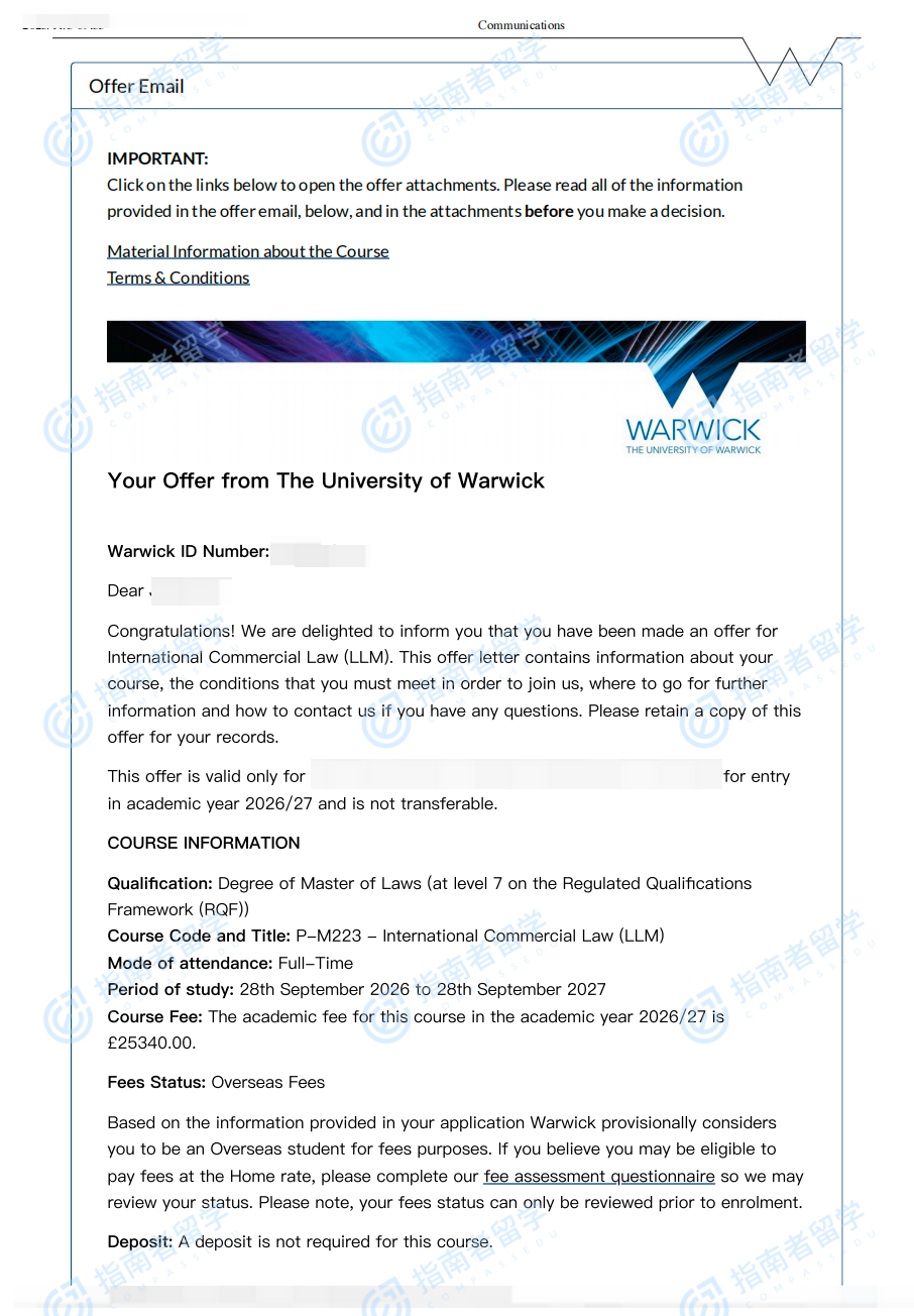 華威大學(xué)國際商法法學(xué)碩士研究生offer一枚