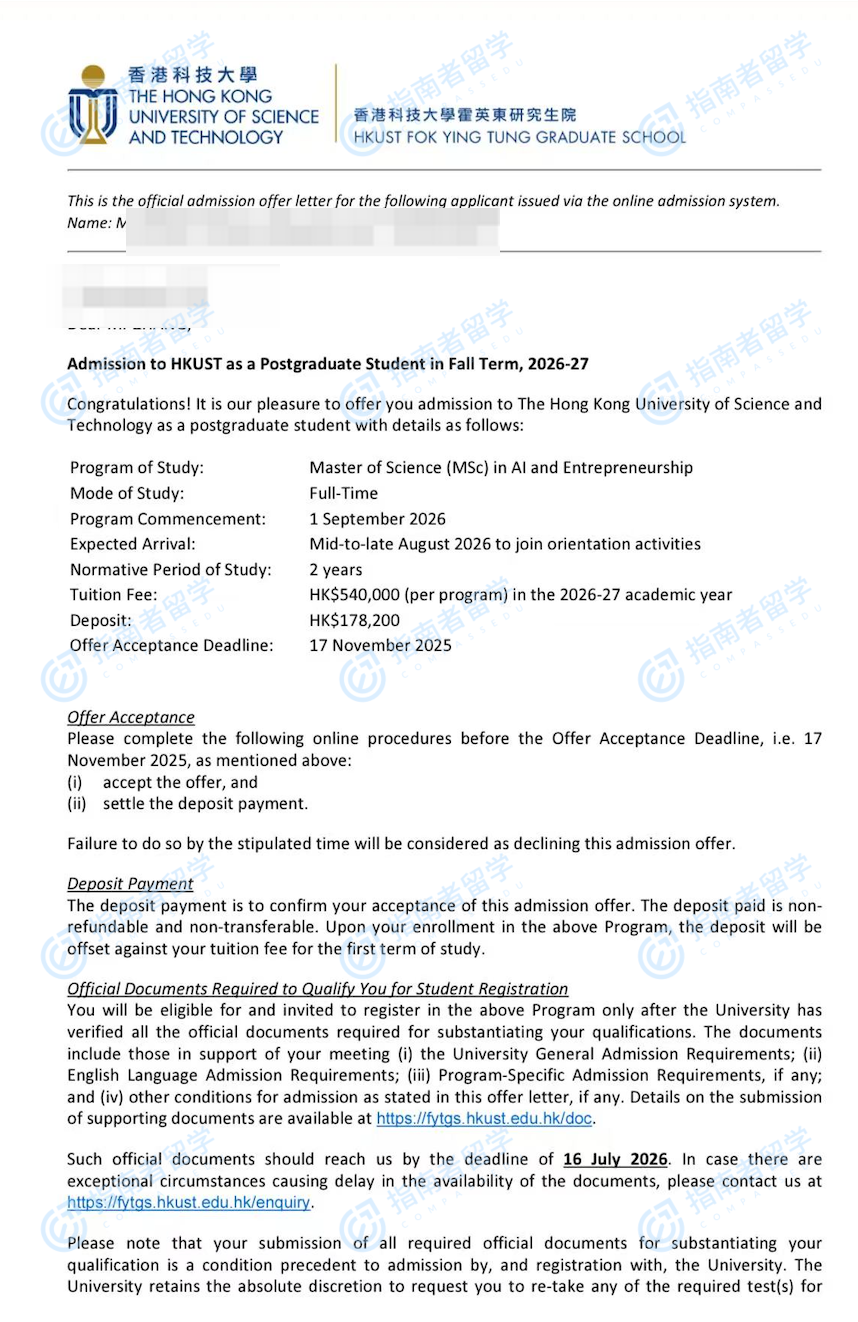 香港科技大學(xué)人工智能與創(chuàng)業(yè)理學(xué)碩士研究生offer一枚