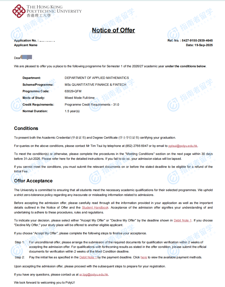 香港理工大學(xué)量化金融與金融科技理學(xué)碩士研究生offer一枚