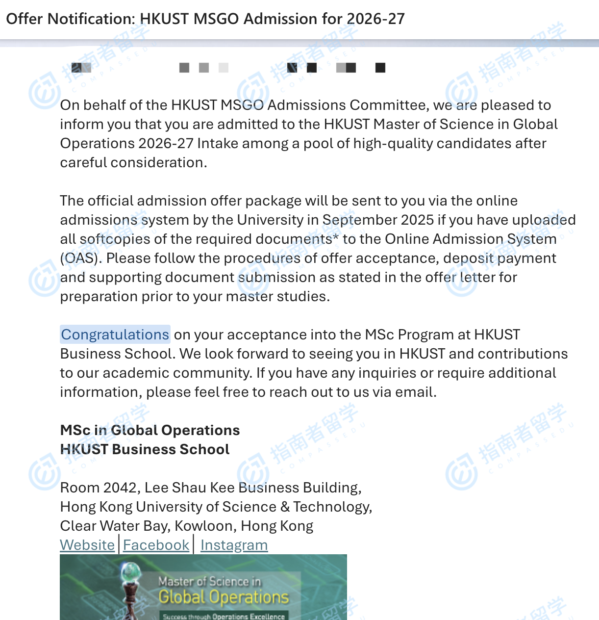 香港科技大學(xué)全球運(yùn)營理學(xué)碩士研究生offer一枚
