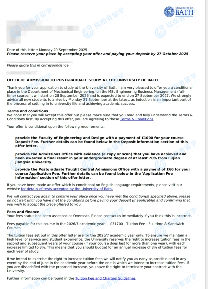 巴斯大學工程商業(yè)管理理學碩士研究生offer一枚