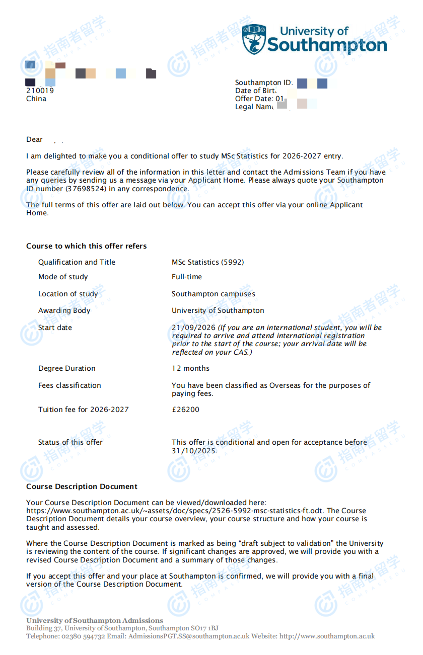 南安普頓大學(xué)統(tǒng)計學(xué)理學(xué)碩士研究生offer一枚