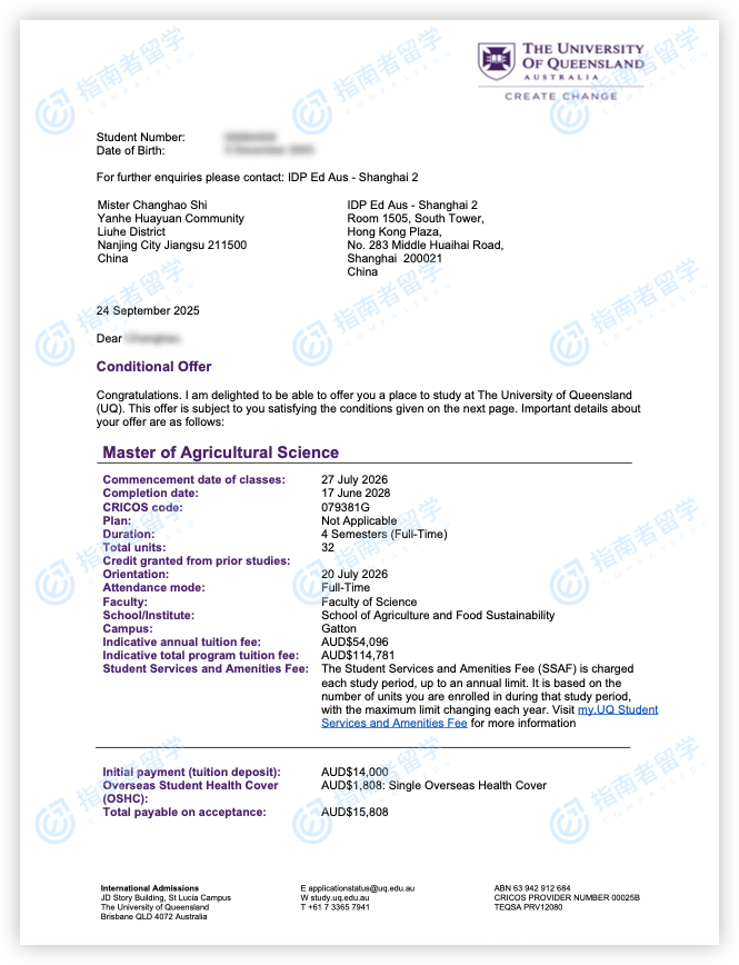 昆士蘭大學農(nóng)業(yè)科學碩士(2年制)研究生offer一枚