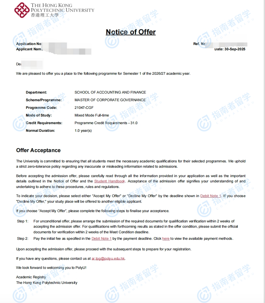 香港理工大學(xué)公司管治碩士研究生offer一枚