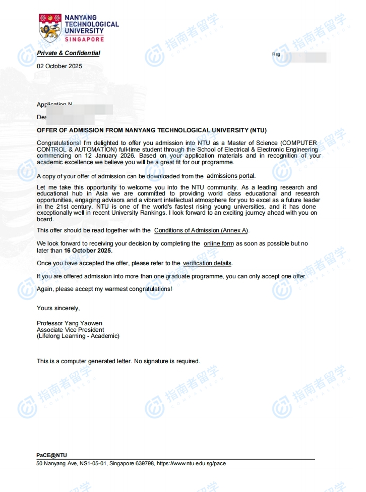 南洋理工大學計算機控制與自動化理學碩士研究生offer一枚