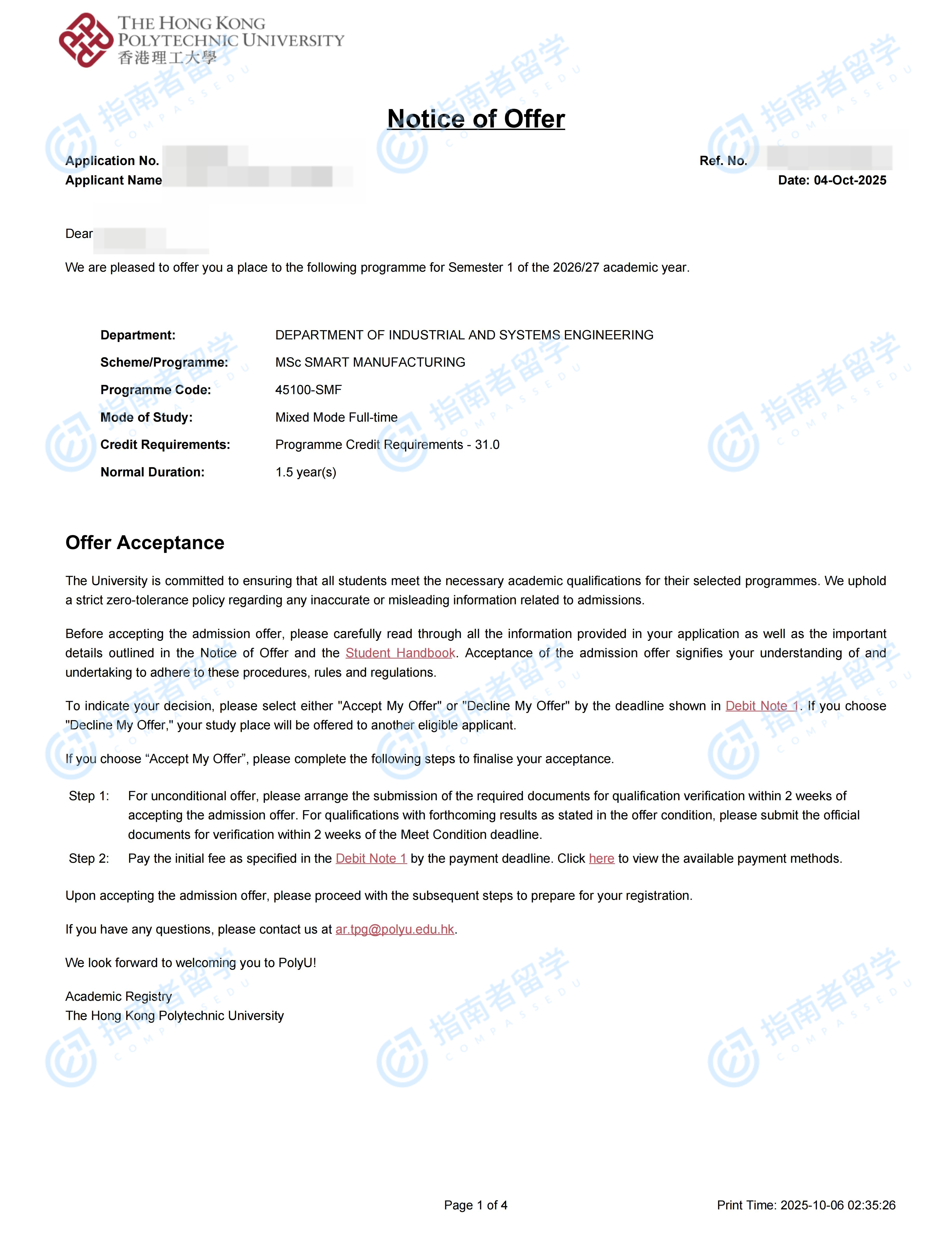 香港理工大學(xué)智能制造理學(xué)碩士研究生offer一枚