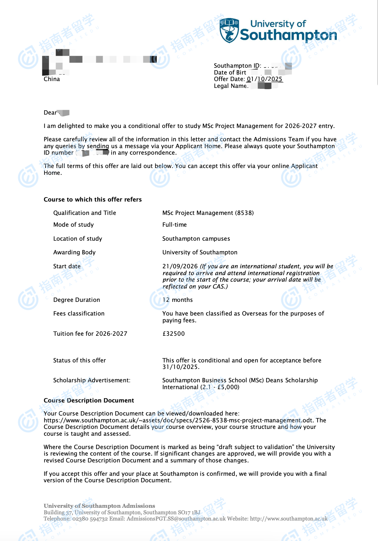 南安普頓大學(xué)項目管理理學(xué)碩士研究生offer一枚