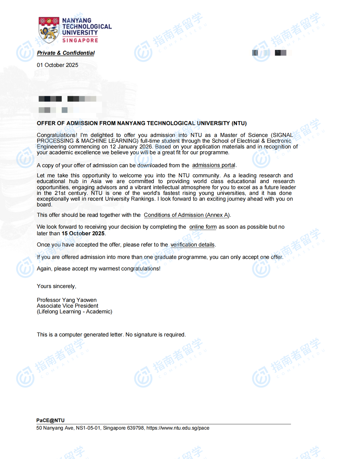 南洋理工大學(xué)信號處理和機(jī)器學(xué)習(xí)理學(xué)碩士研究生offer一枚