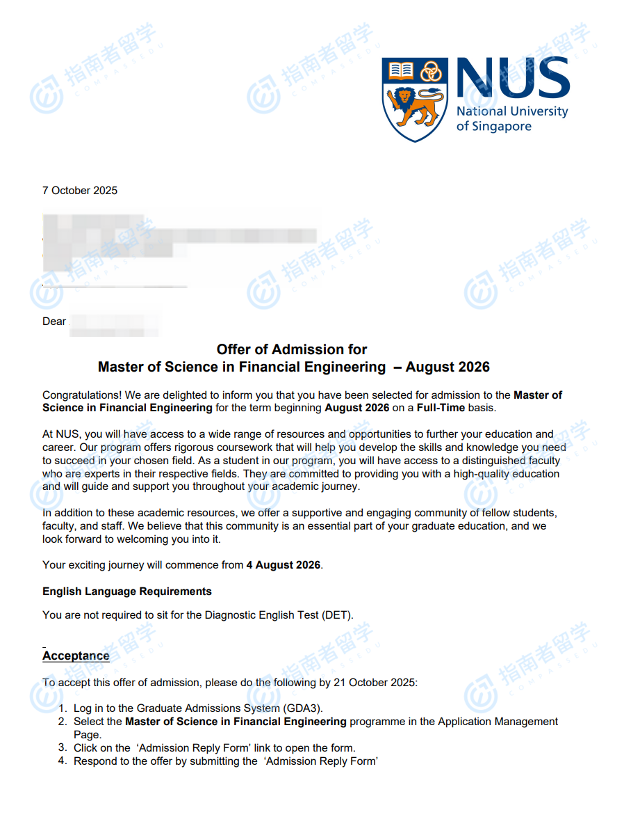 新加坡國(guó)立大學(xué)金融工程理學(xué)碩士研究生offer一枚