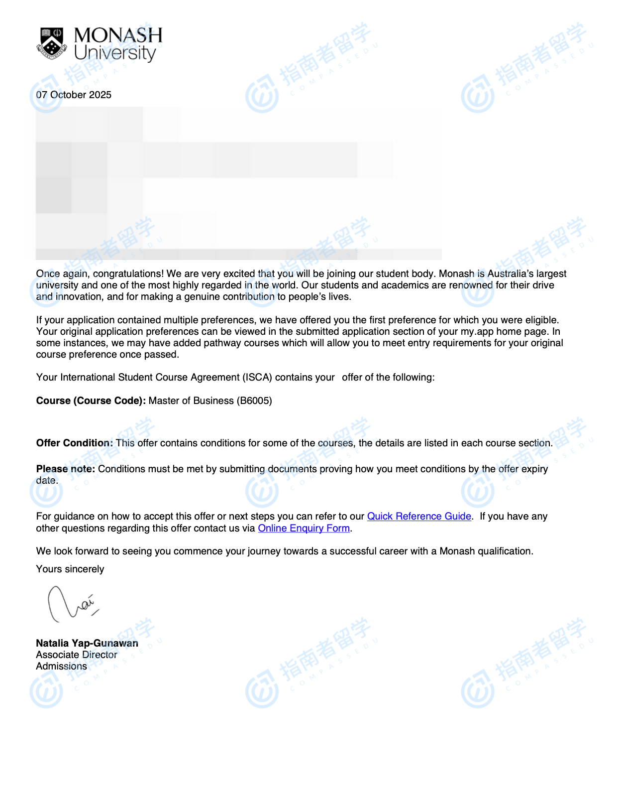 莫納什大學(xué)商業(yè)碩士研究生offer一枚